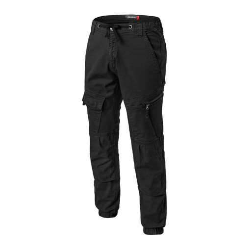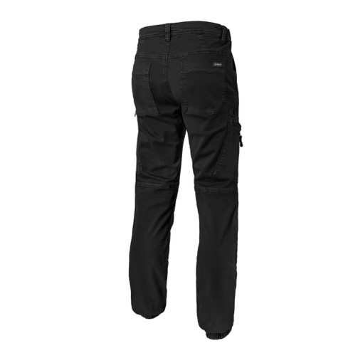 Ceinture semi élastiquée avec cordon de serrage taille, 5 passants, braguette zippée, 2 poches italiennes, 2 grandes poches cuisses zippées dont surpoche smartphone à droite fermée par velcro, 2 poches plaquées au dos, renforts genoux doublé en tissu ripstop avec pinces, bas de jambe resserré par élastique.