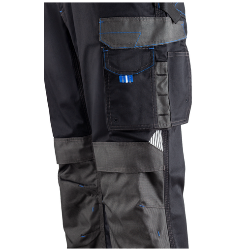Ceinture élastiquée côtés + Passants. Marquage dans la ceinture. Réhausse dos. 2 poches cavalières / 2 poches revolver au dos à rabat / 1 poche cargo à soufflet renforcé + Multi-compartiments / 1 poche téléphone / 1 poche mètre semi-flottante + Multi-compartiments. 1 sangle porte-marteau / 1 sangle porte-outils / Boucle porte badge. Panneau d'aisance entrejambe stretch. Genoux préformés. Poches genoux en Oxford, ouverture parle haut. Nombreux renforts en Oxford. Finitions en coloris contras [...]