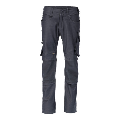 Poches genouillères réglables en CORDURA® particulièrement solides (1000 D) sous rabat avec insertion des genouillères par le haut.