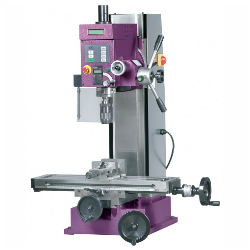 Bâti, tête et socle en fonte aciérée colonne à queue d'aronde arrêt coup de poing à accrochage système de taraudage semi-automatique aux poignées et retour instantané tête de fraisage pivotante à gauche et à droite descente lente écran polycarbonate asservi équipée d'un éclairage table à mouvements croisés, course 145 x 400 mm rainurage de table entraxe 45 mm variateur de vitesse électronique moteur à haut rendement "BRUSHLESS" affichage digital de la vitesse de broche et de la profo [...]