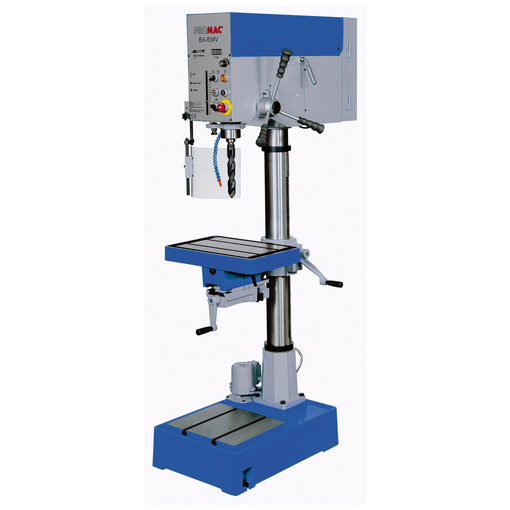 Réglage de la vitesse de rotation par variateur de fréquence affichage digital de la vitesse fonction taraudage par inversion du sens de rotation avec inter de sélection perçage/taraudage table de perçage à 2 rainures parallèles 14 mm table de perçage inclinable à 180° et avec étau de 120 mm de largeur de mâchoires système de lubrification intégré broche avec tire fond M12 pour le maintien de portes outils filetés moteur de la pompe pour liquide de refroidissement : 0,1 kW col de cygne : [...]