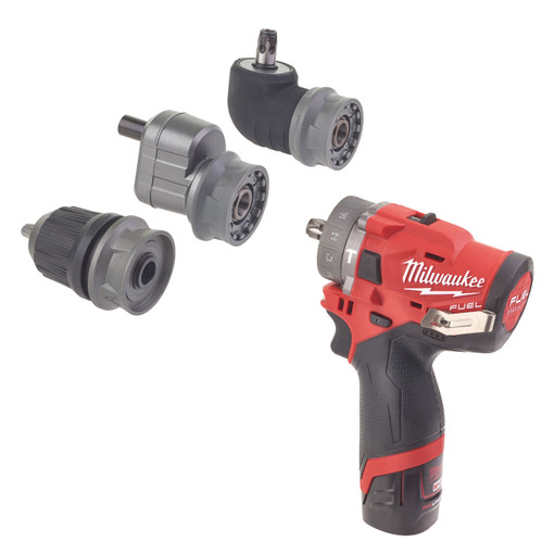 système de têtes à changement rapide et sans outil : tête mandrin auto-serrant 13 mm, tête renvoi d'angle tout métal orientable sur 360°, tête déportée tout métal orientable sur 360°, embout de vissage directement dans la broche de la perceuse