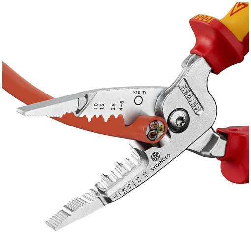 Conforme à la norme DIN EN/IEC 60900 - VDE AC 1000 V.Dénudage astucieux : grande plage de capacité, profils de dénudage parfaitement affûtés et positionnement intuitifgéométrie de coupe innovante : coupe simplifiée, en particulier des câbles platsconception hybride : aussi plate qu'une pince à bec effilé et aussi large qu'une pince universelle pour une grande stabilité et une bonne accessibilitéprofils de dénudage affûtés avec soin pour conducteurs rigides de 0,75 à 6 mm² et conducteurs [...]