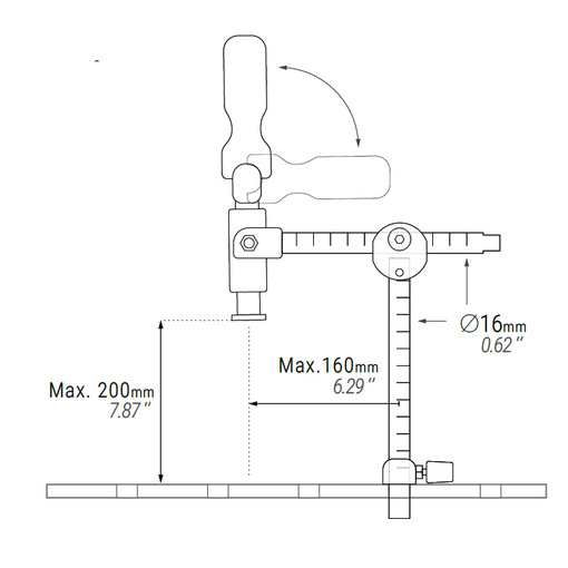 Conçu pour résoudre tous les besoins de serrage sur table avec un seul outilAdaptable à n'importe quel diamètre standard, à différents anglesPour fixation horizontale et verticaleTiges et jointures en acier au carbone zinguéManche interchangeable en PA avec fibre de verreSystème de piston fin à double filetage protégé par un trou pour graisser le mécanismeSurface de pression du piston a un filetage M6 pour l'union d'accessoiresPuissance de serrage : 350 kgØ de tige : 16 mmhauteur max. sous p [...]
