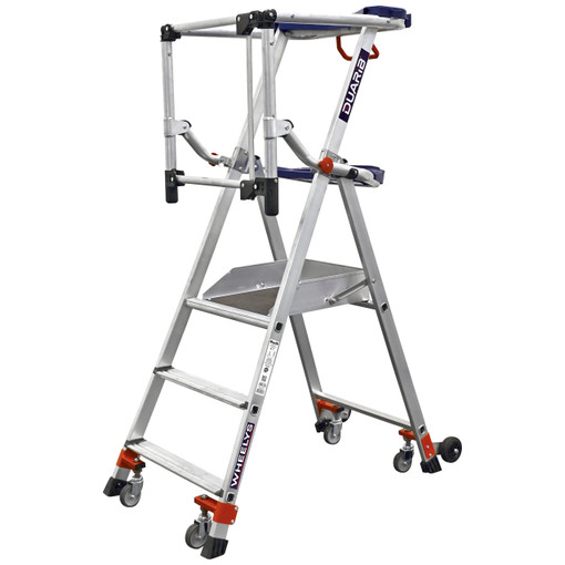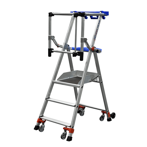 Ultra-mobile, 4 roulettes pivotantes plancher antidérapant : 0,50 x 0,40 m stable automatiquement dès la montée de l'opérateur, la plate-forme prend appui sur ses 4 patins marches largeur 80 mm mise en place facilitée, installation de l'ensemble garde-corps en un seul geste protection arrière par garde-corps rigide et articulé 2 tablettes de série avec compartiments. charge utile 150 kg Dim. plié: H 2.06 m x L 0.67 m x Ep 0.25 m pour le 3 marches Dim. plié: H 2.36 m x L 0.79 m x Ep 0.25 m. pour [...]