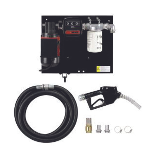Pompe à palettes avec by-pass intégré pour fuel domestique et gazole interrupteur marche/arrêt système protection contre "l'autosiphonage prémonté sur plaque (GPM)pour montage mural et citerne compteur mécanique NUMERIxx3, trois chiffres pistolet automatique avec raccord tournant flexible de refoulement, 8m raccord tournant filtre gazole interchangeable, 30 µm clapet de pied avec crépine encapsulage du moteur électrique (évite la formation d'eau de condensation) IP66 raccordement 1"GF puissan [...]