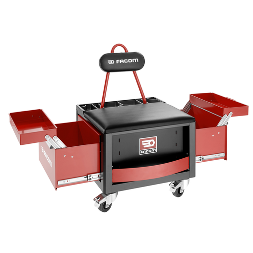 Outils conservés bien rangés et à portée de main 2 bacs-tiroirs permettant de rangement d'éléments volumineux, idéal pour outils à moteur, bidons, bombes aérosol de peinture, tous deux équipés de 1 plateau-console permettant un rangement organisé compatible avec plateau en mousse et plastique FACOM tiroirs verrouillables 1 porte-bidons, positionnement au choix à l'avant ou l'arrière 1 plateau plastique pour petites pièces sur le dessus du coffre, facile à déplacer roues extra-robustes de [...]