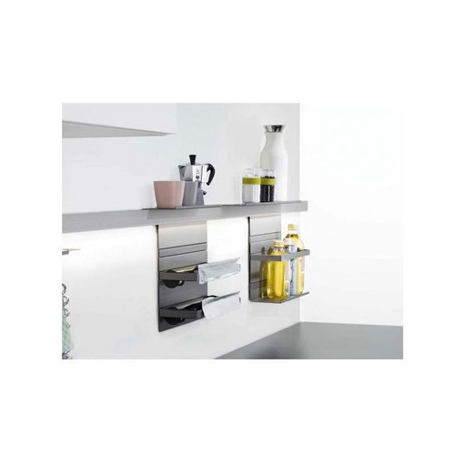 La ligne d accessoires de crédence Linero MosaiQ sait allier Elégance et Design avec polyvalence et fonctionnalité.Le profil porte accessoires en aluminium décor inox peut être vissé ou collé à la paroi, et de ce fait fixé sur une crédence en verre. Il peut être utilisé comme bandeau lumineux, en intégrant un ruban LED dans le profil, il diffuse alors un éclairage indirect sur les différents éléments.Les éléments MosaiQ sont à suspendre ou à poser.La finition résistante laquée mat des accessoires a été élaborée en collaboration avec un institut de design et se décline en deux élégantes nuances de gris. Esthétique et design, ils sont soulignés par les éléments décoratifs horizontaux.