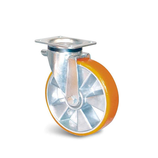 ROULETTE DE MANUTENTION A PLATINE PIVOTANTE A BLOCAGE A PLATINE ALU/PU Ø200 400K |