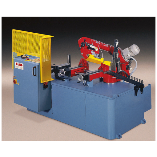 Système de lubrification par mélange eau/huile soluble machine entièrement hydraulique entrainement volant moteur par pignon/roue dentée cémentés trempés réglages de pression et d'avance de coupe différenciés contrôle électrique de la tension du ruban palpeur de capacité système automatique de chargement des barres métalliques approche rapide ruban arrêté brosse chasse-copeaux guides lame réglable réglage longueur de coupe par tambour avec lecture sur compteur répétiteur avance barre [...]