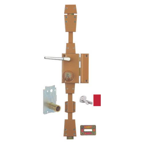 Serrure époxy bronze coffre cambré 75 x 130 mm axe à 45 mm jeu de tringles hauteur de porte de 2,25 m maxi fourni avec béquille simple aluminium plaque de renfort de la serrure, 2 goupilles en acier trempé dansle pêne dormant (protection contre le sciage) cabochon de protectionen acier contre l'arrachement du cylindre plaque de blindage en aciercementé trempé contre le perçage du coffre 2 goupilles de protection contre le perçage du cylindre cylindre rond Ø 23 mm, mécanisme à 6 goupilles (4 [...]