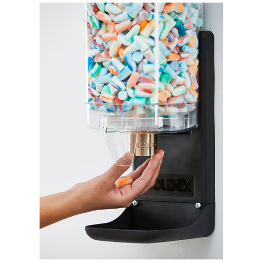 PlugStation 500 antimicrobial de 500 paires de bouchons d'oreilles mousse, forme anatomique, faits en mousse de PU matériau doux, bouchons faciles à mettre en place pour se protéger pendant de longues périodes d'exposition. La molette du distributeur est recouverte d'une surface en cuivre CuVerro® V qui détruit 99,9% des bactéries résiduelles après utilisation.