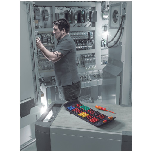 Conforme à la norme IEC 60900. Trousse de textile robuste et pratique contenant : 2 manches Kraftform 817 VDE 9 x 98 mm 24 lames interchangeables VDE avec repéreur d'outils "Take it easy" (code couleur en fonction des empreintes et indication de la taille gravée au laser): Philips Kraftform Kompakt VDE 62 iS Take it easy : PH1 x 157 mm, PH2 x 157 mm Pozidriv Kraftform Kompakt VDE 65 iS Take it easy : PZ1 x 157 mm, PZ2 x 157 mm Fente/Pozidriv Kraftform Kompakt VDE 65 iS PZ/S Take it easy : PZ/S1 x 157 m [...]
