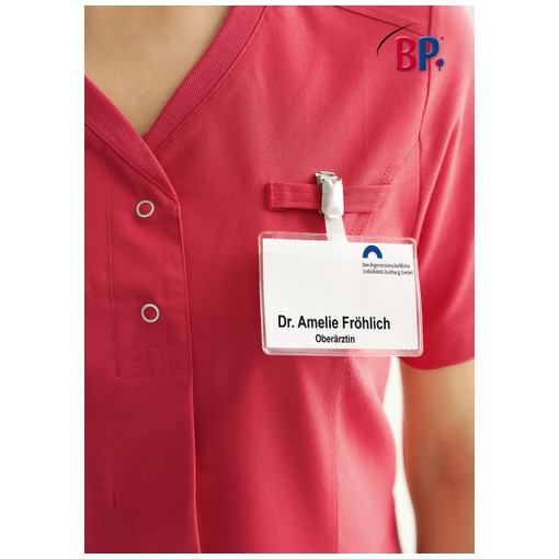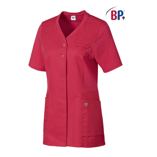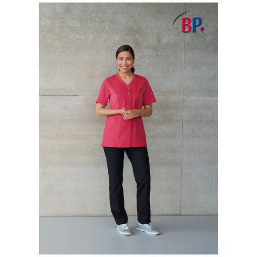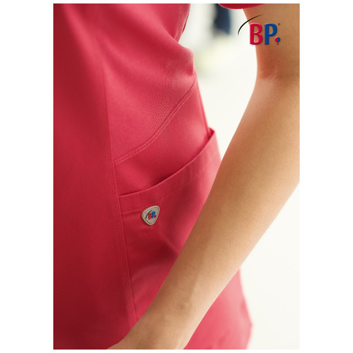 Manches 1/2, liberté de mouvement maximale grâce aux empiècements en piqué, encolure en V, patte à boutons-pression dissimulée dont 2 boutons-pression visibles, 2 grandes poches latérales dont 1 avec poche pour bip, passant pour badge