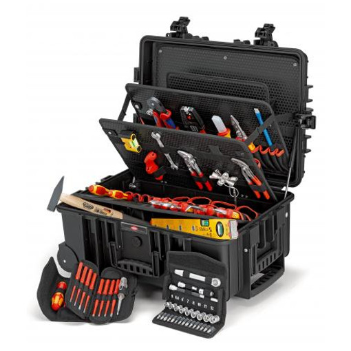 Mallette à outils "Robust45" Électro63 outilspour les conditions sévères : étanchéité à la poussière, à l'eau et résistance aux températuresantichoc, apte au transport aérienclapet, automatique de compensation de pressioncomposition :1 x KNIPEX TwinKey® Clé universelle pour armoires de commande pour toutes les armoires et systèmes de fermeture standard1 x Pince universelle multifonctions1 x KNIPEX MultiStrip 10 Pince à dénuder automatique (0,03 10,0mm²)1 x Pince pour installations éle [...]