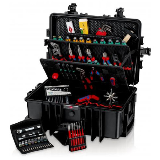 Mallette "Robust45 Move" 90 outilsroulettes et poignée télescopiques -14 outils KNIPEX et autres outils de marques -polypropylène antichocapte au transport aérienétanche eau et poussièreporte documents et plateaux à outilscomposition :1 x KNIPEX TwinKey® Clé universelle pour armoires de commande pour toutes les armoires et systèmes de fermeture standard1 x Couteau pliant d'électricien1 x KNIPEX ErgoStrip® Outil universel à dégainer (Ø 8,0 13,0 mm)1 x Pince demi-ronde avec tranchant (pince [...]