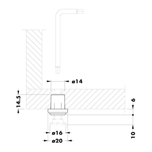 Vérin à encastrer, perçage de diamètre 14mm.Très utile pour mettre de niveau des meubles qui posent au sol. Peut être mis sur les côtés mais également au centre, sur des meubles qui tendent à se courber au sol.Réglage de +10mm avec clé 6 pans.