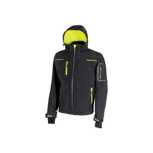 Veste softshell avec membrane U-Tex qui rend le tissu imperméable, respirant et coupe vent. Doublure intérieure en micro polaire souple. Fermeture centrale à glissière hydrofuge. Manche préformées pour un ajustement optimal avec poignets réglables à velcro avec passe-pouce. 2 poches sur le devant à zip avec à l'intérieur un cordon de serrage pour réglage taille. 1 poche thermosoudée sur la manche gauche. 1 poche porte téléphone sur le devant à glissière fluo avec technologie free sound. [...]