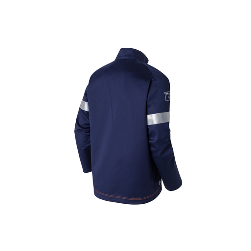 Col montant, fermeture glissières sous patte pressionnée, 2 passants poitrine pour détecteurs gaz, 1 poche poitrine plaquée sous rabat pressionné, 1 poche asymétrique sous rabat pressionné avec détail surpiqure fantaisie et 2 poches côtés sous rabat avec points d'arrêts contrastés. Manches raglan et poignets réglables par pressions. Bandes rétroréfléchissantes largueur 50mm répondant à la norme 17353. 1 marquage transfert FR pictogrammes sur manche gauche, 1 marquage transfert FR zon [...]
