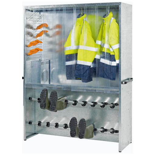 Construction monobloc en tôle d'acier galvanisé anti-corrosion épaisseur de tôle en 12/10e , fond en 10/10e rideaux à lames verticales en PVC translucide penderie fermée pour séchage des vestes 20 supports ventiles pour le séchage de 10 paires de bottes poignées de manutention système de ventilation d'air chaud puissance 1600 W alimentation 230V temps de séchage : 1 à 4 heures temporisation avec arrêt automatique au bout des 4 heures. Système de séchage collectif et économique [...]