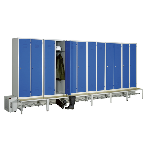 séchage rapide des vêtements à l'intérieur du vestiaire ainsi que des chaussures de travail à l'extérieur (posées sous le socle-banc)